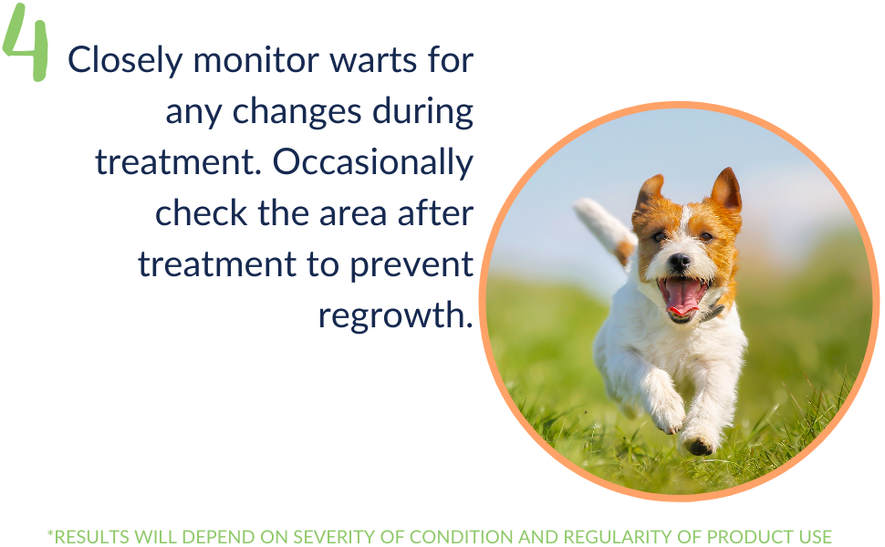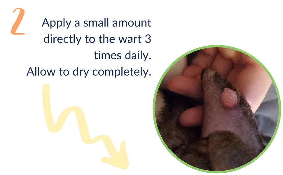 "So happy to find a natural cure. Been applying for three weeks and the wart on our dog's ear is almost completely gone. Made a daily chart to check off so we would make sure to apply 3 times a day. Company was great to work with - our original bottle arrived broken and they replaced it immediately. 5 stars!!!"