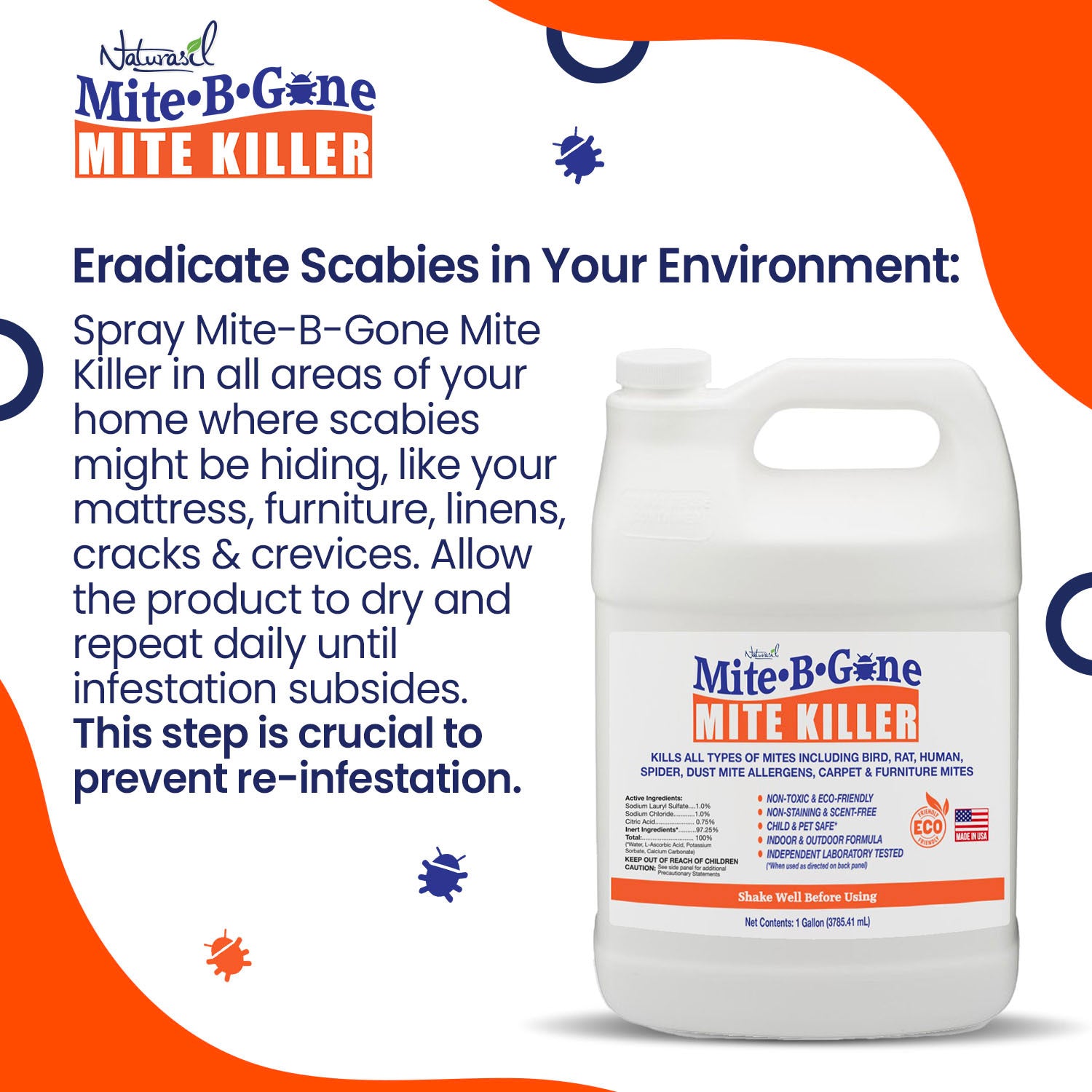 The all-natural, mild formula eliminates mites within 2 minutes of contact, leaving no stains or surface damage.