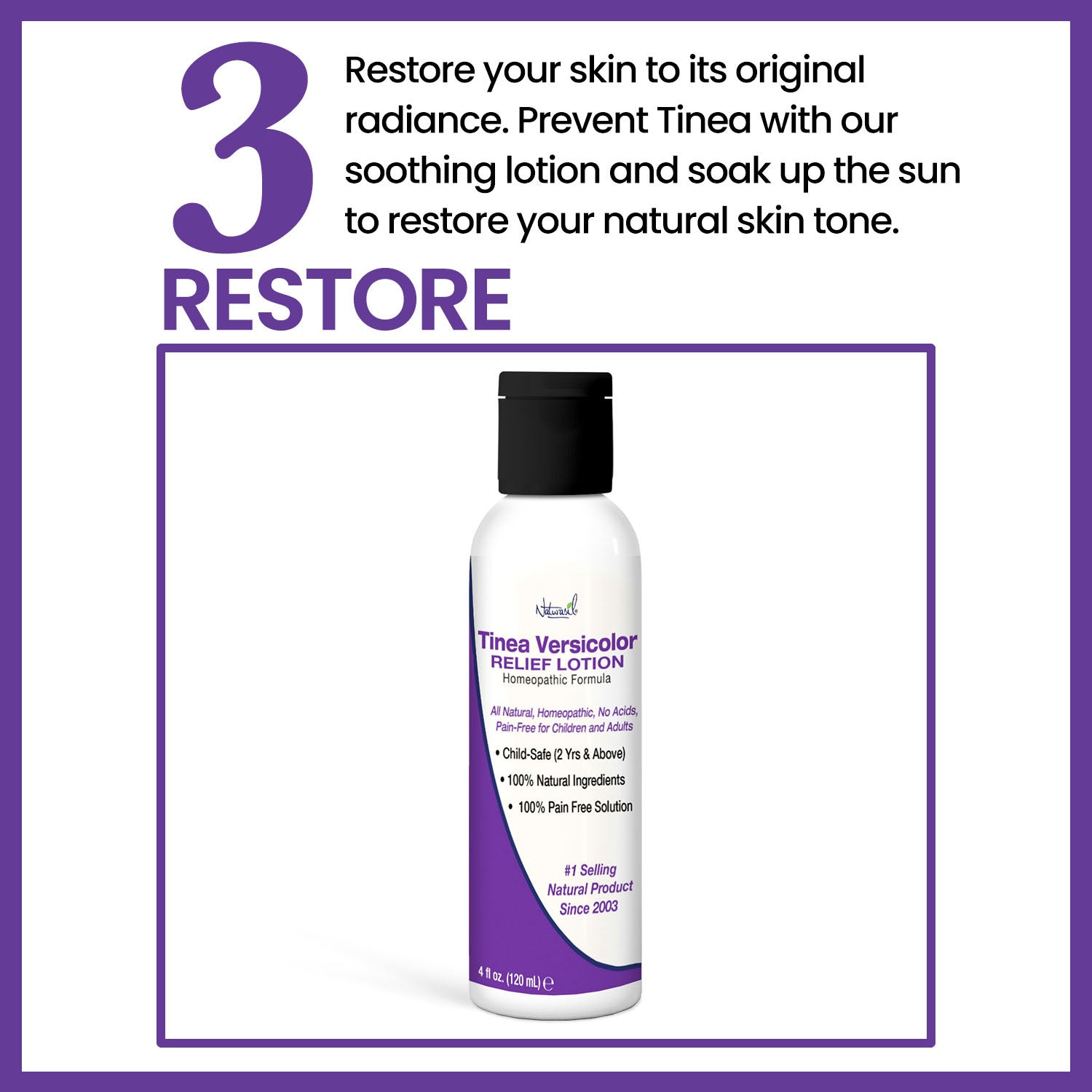 Please note: This is IMPORTANT! You will need to spend time in the sun once the fungus is gone to return pigment to your skin. The Tinea Versicolor fungus depletes pigmentation in the skin. The only way to even out skin tones is to spend time in the sun, which brings melanin back to the surface, returning color to the splotchy areas.