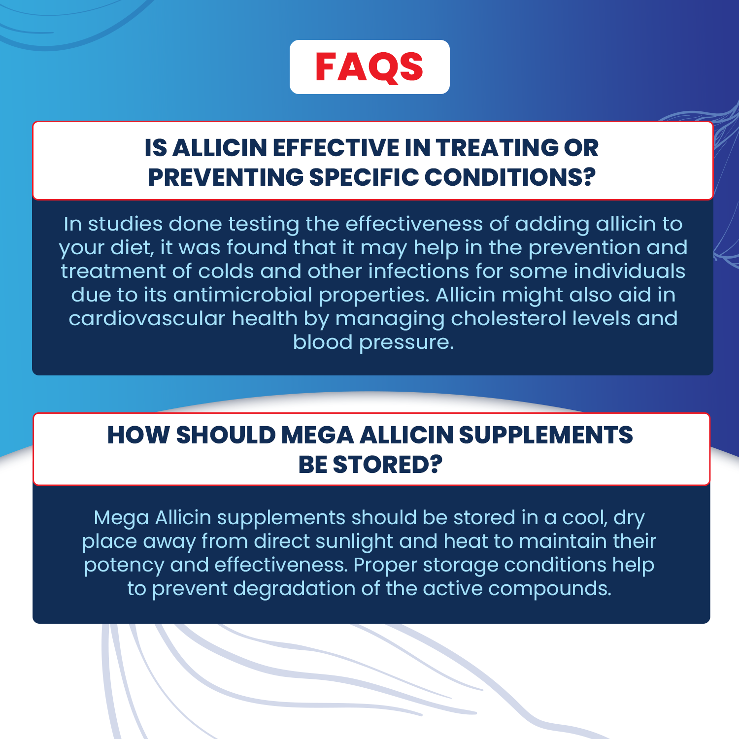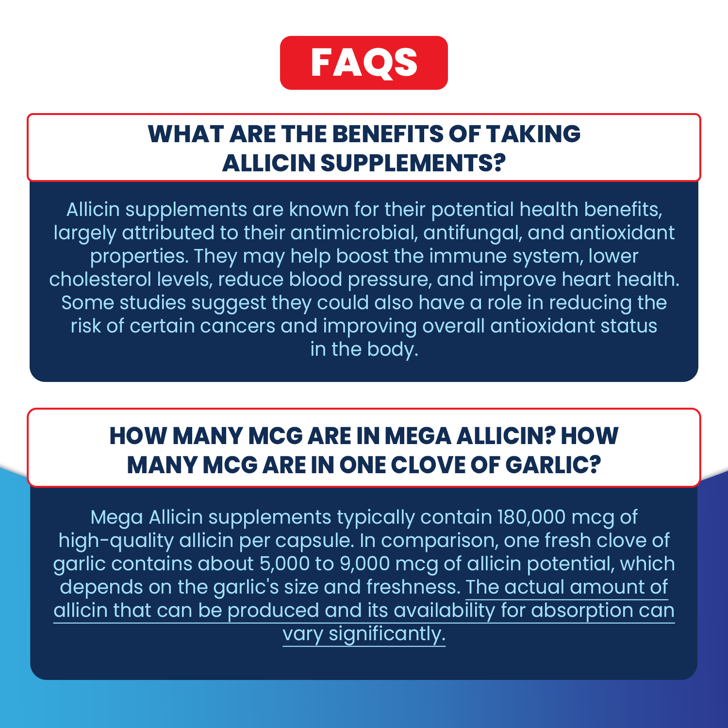The Mega Allicin supplement comes in a 90-count bottle and contains 180 mg of 100% patented allicin. Allicin is the essential component found in garlic that has been scientifically tested for its super-allicin potency. This supplement guarantees maximum strength and benefits for its users.